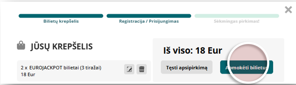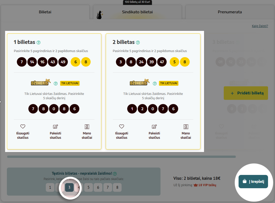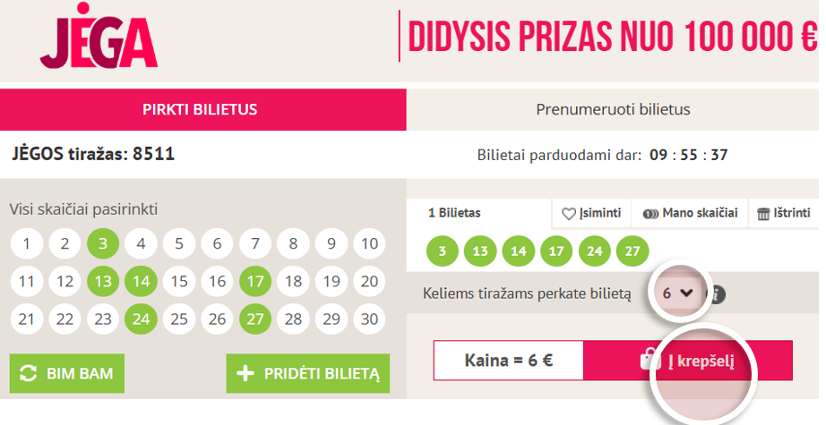 Peržiūrėkite bilietų informaciją ir išsirinkite, keliuose tiražuose žaisite su tuo pačiu skaičių deriniu ir spauskite „Į krepšelį“. Pavyzdžiui:
