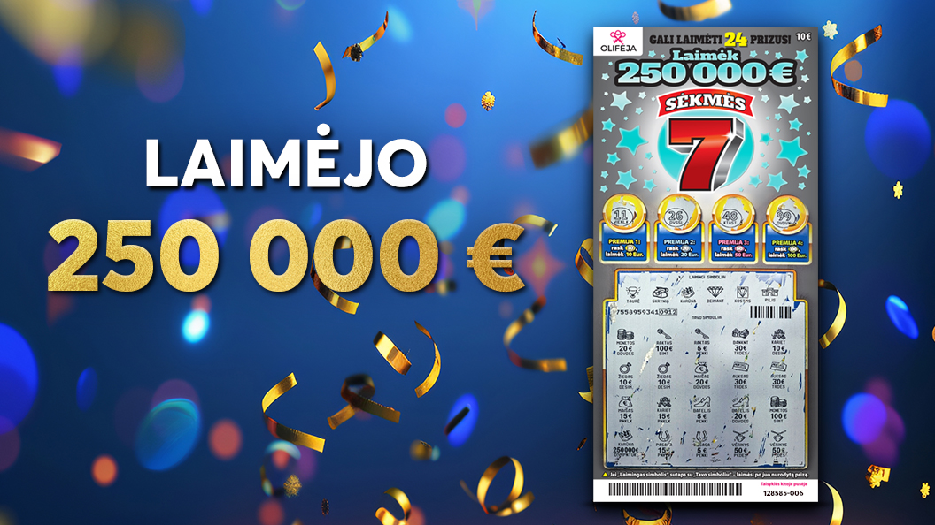 250 000 eurų laimėjimą atnešęs momentinės loterijos „Sėkmės 7“ bilietas kainavo 10 eurų. Šį ir kitus nutrinamus bilietus rasite prekybos vietose.